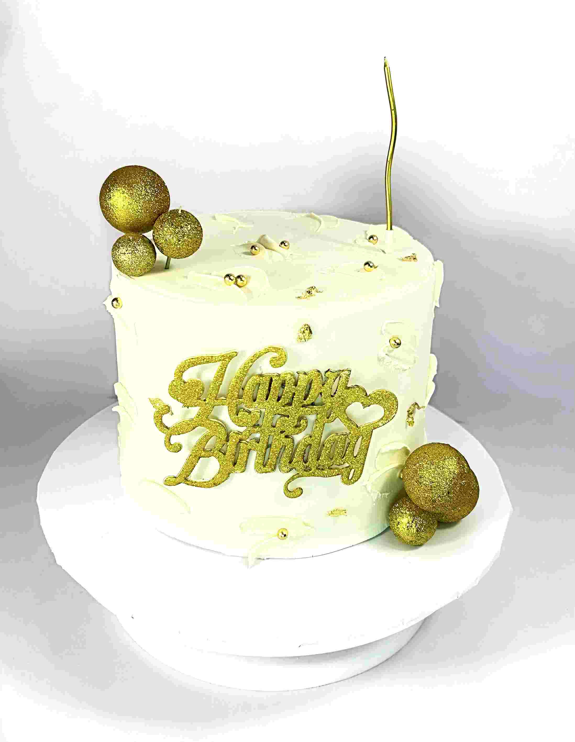 triple-layer vanilla cake with gold accents, serves 20. A premium celebration cake.
